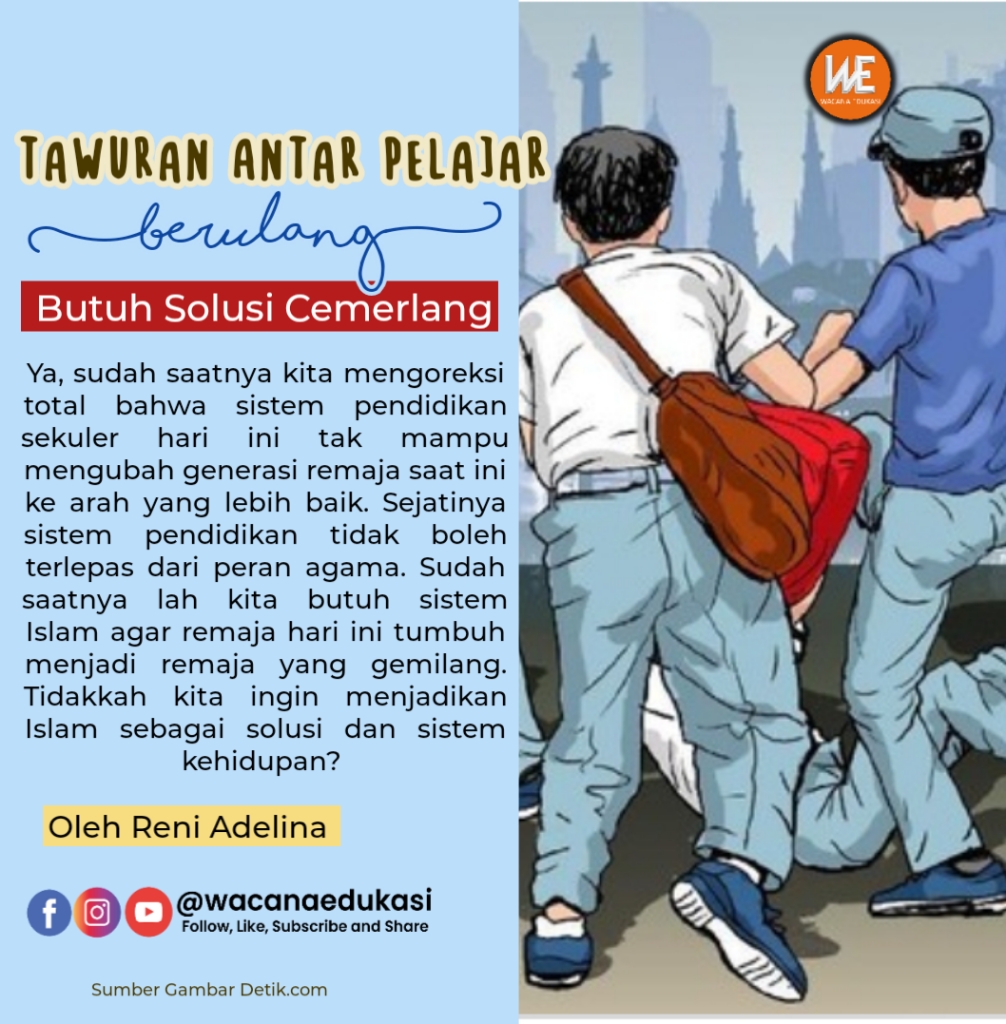 Ya, sudah saatnya kita mengoreksi total bahwa sistem pendidikan sekuler hari ini tak mampu mengubah generasi remaja saat ini ke arah yang lebih baik. Sejatinya sistem pendidikan tidak boleh terlepas dari peran agama. Sudah saatnya lah kita butuh sistem Islam agar remaja hari ini tumbuh menjadi remaja yang gemilang. Tidakkah kita ingin menjadikan Islam sebagai solusi dan sistem kehidupan?