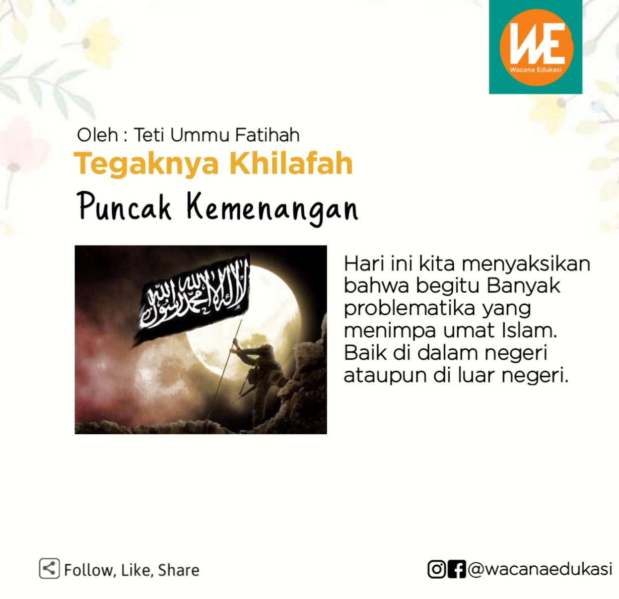 Wacana Edukasi adalah sarana edukasi masyarakat. Silakan kirimkan tulisan anda ke media kami. Wacana Edukasi akan melakukan seleksi dan menayangkan berbagai naskah dari Anda. Tulisan yang dikirim bisa berupa Opini, SP, Puisi, Cerpen, Sejarah Islam, Tsaqofah Islam, Fiqih, Story Telling, Olah raga, Kesehatan, Makanan, ataupun tulisan lainnya. Tulisan tidak boleh berisi hoaks, mengandung SARA, ujaran kebencian, dan bertentangan dengan syariat Islam. Tulisan yang dikirim sepenuhnya menjadi tanggungjawab penulis.