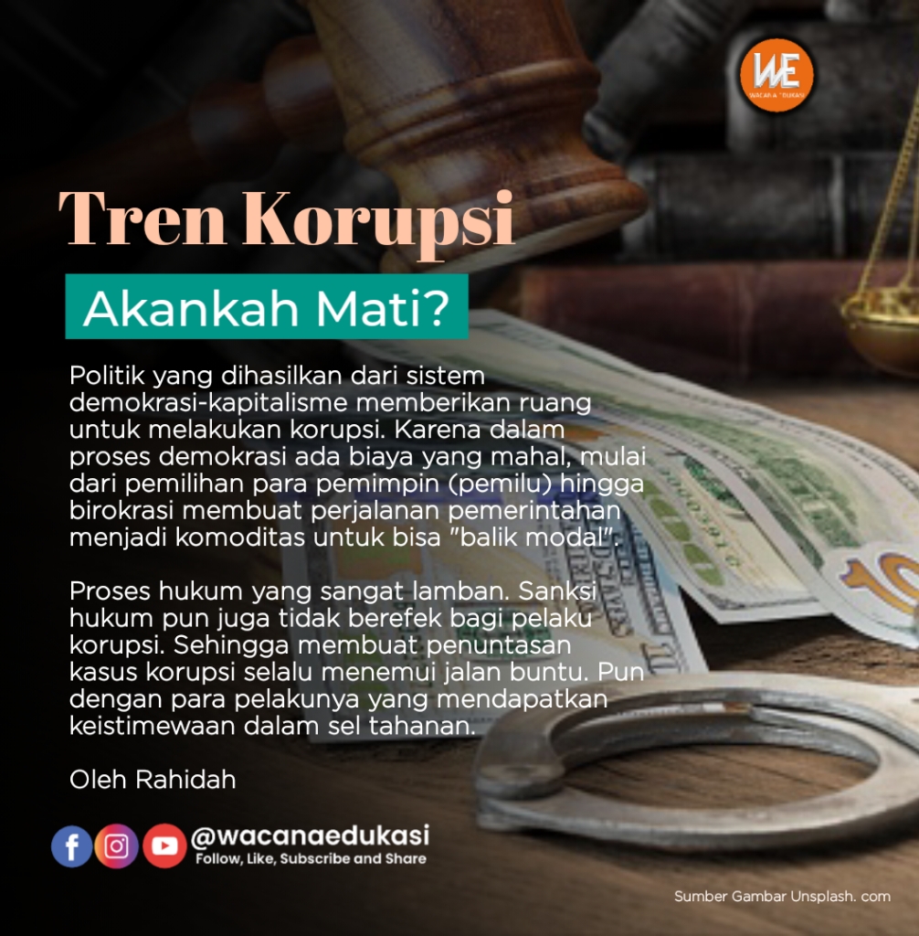 Beginilah politik yang dihasilkan dari sistem Demokrasi-Kapitalis. Peluang untuk melakukan korupsi sangatlah luas. Karena dalam proses Demokrasi ada biaya yang mahal. Mulai dari pemilihan para pemimpin (pemilu) hingga birokrasi membuat perjalanan pemerintahan menjadi komoditas untuk bisa “balik modal”.