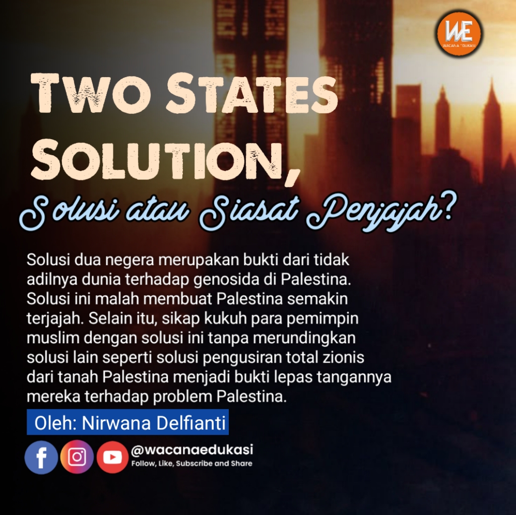 Jadi, solusi dua negara bukanlah solusi, namun siasat agar tanah milik kaum muslim dirampas kembali oleh zionis dan antek-anteknya. Mengingat bagaimana tabiat zionis setelah peristiwa-peristiwa yang berlalu, mereka dikenal sebagai manusia-manusia yang selalu ingkar janji. Artinya tak menutup kemungkinan bahwa keputusan ini bukanlah untuk menyejahterahkan semuanya, melainkan untuk meleburkan salah satunya (Palestina).
