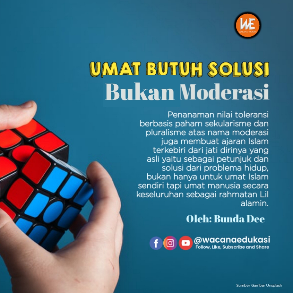 Bagi umat Islam yang peka, moderasi beragama tidak bisa dianggap biasa. Selain ada sisi politis yakni melanggengkan penjajahan juga menyasar hal-hal yang sangat prinsip dalam Islam. Sampai kapan mereka terus membodohi umat, bahkan para ulama dan cendikiawanpun diperalat. Padahal kunci kebaikan dan solusi kehidupan ada pada agama, yaitu Islam Ideologi yang sempurna. Kemulian sejati hanya ada pada Islam.