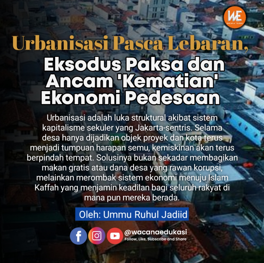 Urbanisasi adalah luka struktural akibat sistem kapitalisme sekuler yang Jakarta-sentris. Selama desa hanya dijadikan objek proyek dan kota terus menjadi tumpuan harapan semu, kemiskinan akan terus berpindah tempat. Solusinya bukan sekadar membagikan makan gratis atau dana desa yang rawan korupsi, melainkan merombak sistem ekonomi menuju Islam Kaffah yang menjamin keadilan bagi seluruh rakyat di mana pun mereka berada.