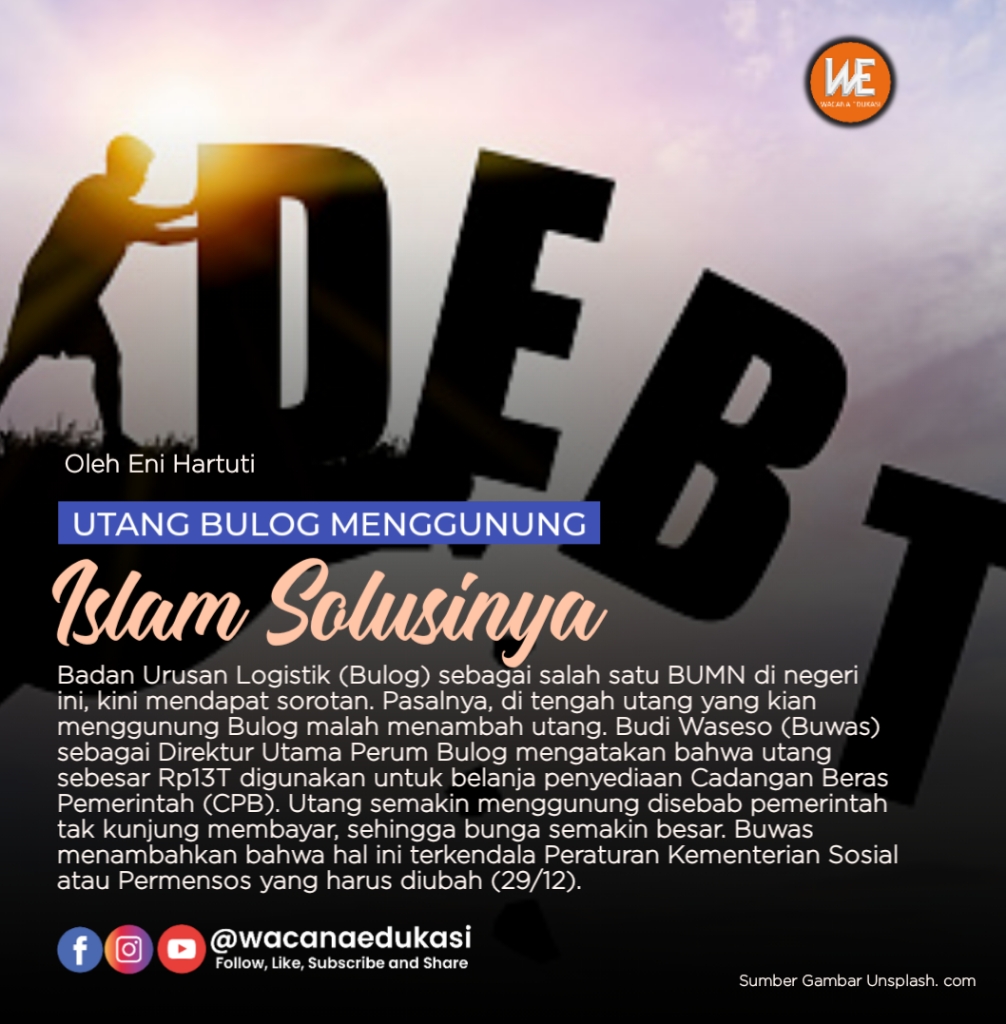wacana-edukasi.com– Badan Urusan Logistik (Bulog) sebagai salah satu BUMN di negeri ini, kini mendapat sorotan. Pasalnya, di tengah utang yang kian menggunung Bulog malah menambah utang. Budi Waseso (Buwas) sebagai Direktur Utama Perum Bulog mengatakan bahwa utang sebesar Rp13T digunakan untuk belanja penyediaan Cadangan Beras Pemerintah (CPB). Utang semakin menggunung disebab pemerintah tak kunjung membayar, sehingga bunga semakin besar. Buwas menambahkan bahwa hal ini terkendala Peraturan Kementerian Sosial atau Permensos yang harus diubah (29/12).