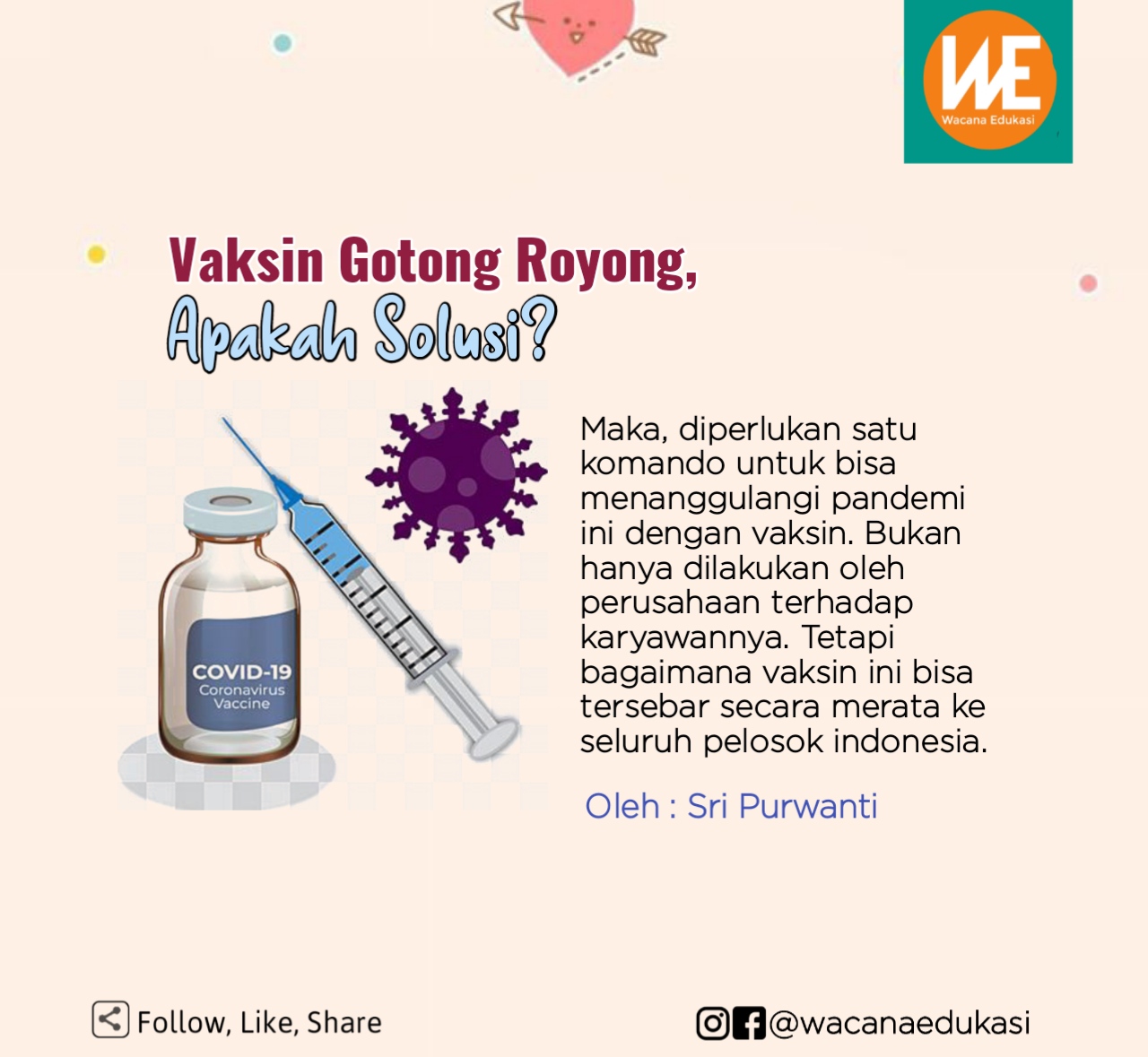 wacana-edukasi.com, Pandemi Covid-19 masih belum berakhir. Berbagai usaha dilakukan untuk mengurangi jumlah kasus infeksi virus ini. PSBB, New Normal, kebiasaan 3M (Memakai masker, mencuci tangan, menjaga jarak), juga yang tak kalah pentingnya dilakukan juga vaksinasi.
