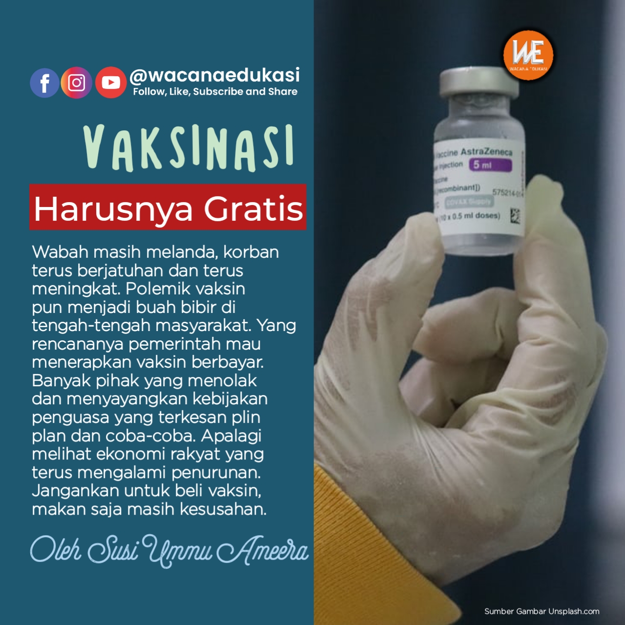 wacana-edukasi.com — Wabah masih melanda, korban terus berjatuhan dan terus meningkat. Polemik vaksin pun menjadi buah bibir di tengah-tengah masyarakat. Yang rencananya pemerintah mau menerapkan vaksin berbayar. Banyak pihak yang menolak dan menyayangkan kebijakan penguasa yang terkesan plin plan dan coba-coba. Apalagi melihat ekonomi rakyat yang terus mengalami penurunan. Jangankan untuk beli vaksin, makan saja masih kesusahan.
