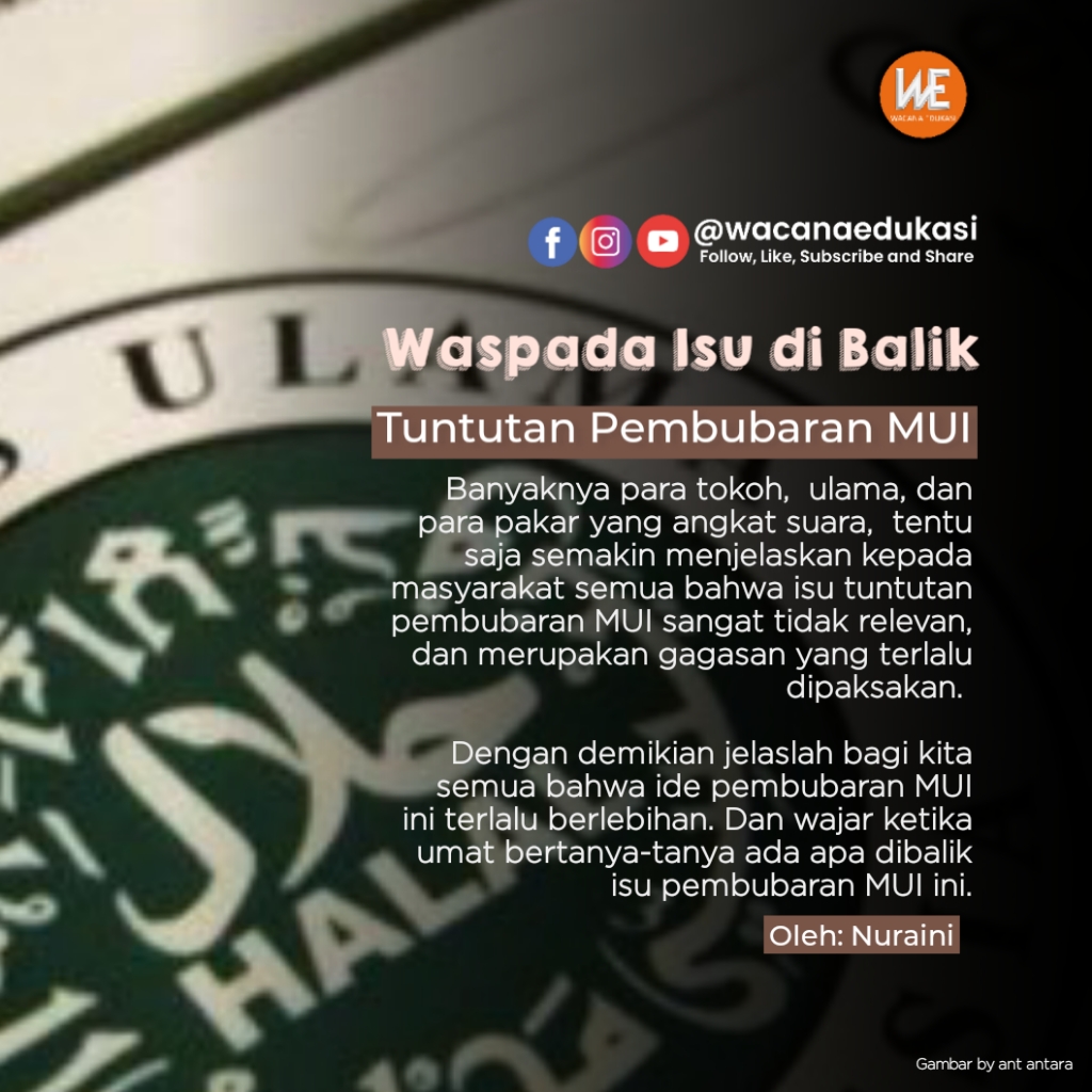 wacana-edukasi.com– Tuntutan untuk membubarkan MUI ramai disuarakan di media sosial akhir-akhir ini. Tagar tuntutan #BubarkanMUI beredar luas setelah ditangkapnya anggota komisi fatwa MUI, Ahmad Zain an-Najah, pada hari selasa(19/11) lalu oleh Densus 88 karena diduga ada keterlibatan dengan terorisme.