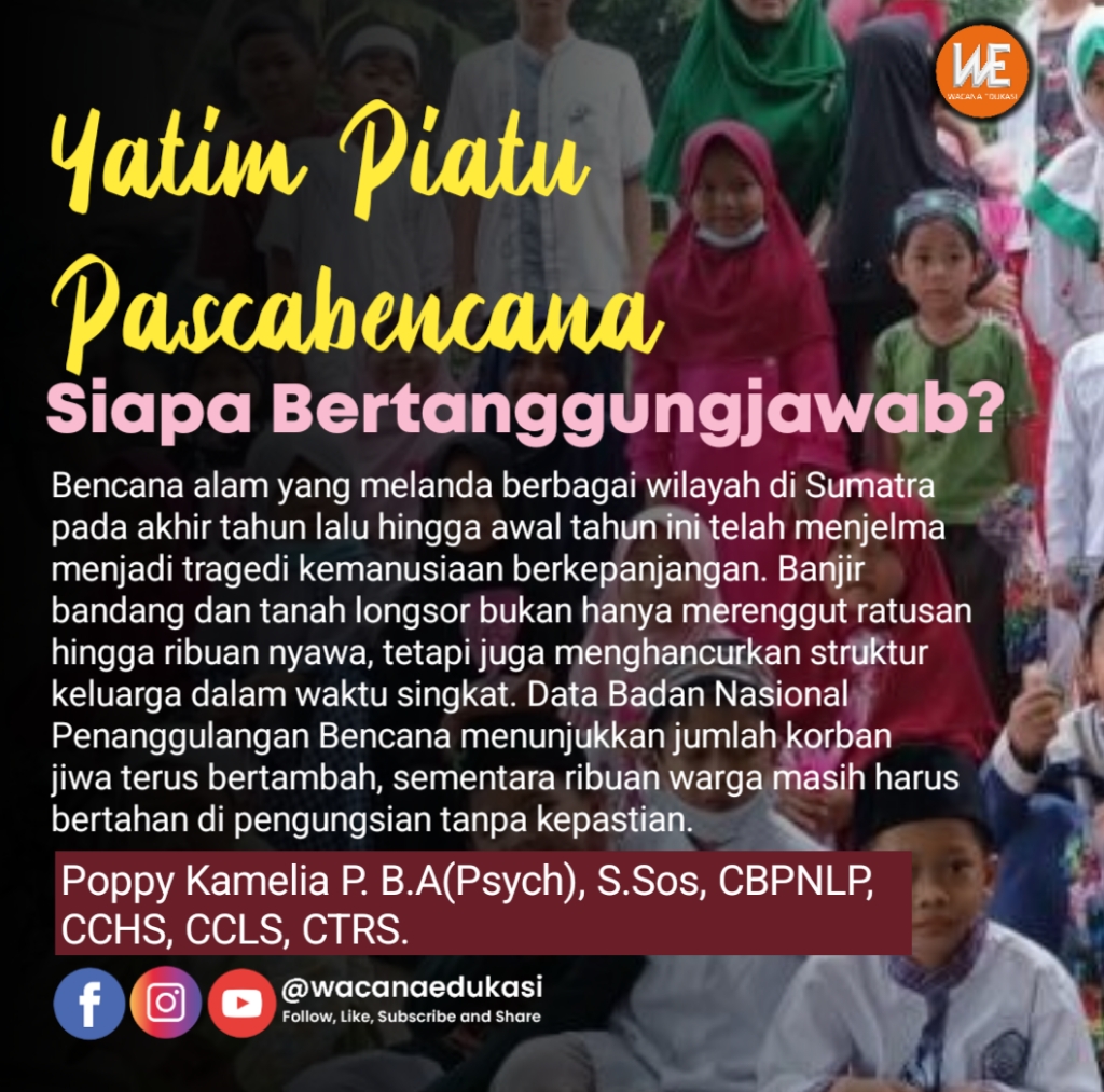 Kondisi ini memunculkan pertanyaan mendasar yang tidak bisa dihindari, yakni tanggung jawab siapa terhadap anak anak yang kini hidup tanpa orang tua. Mereka kehilangan hak hak dasar sebagai anak, mulai dari pengasuhan, pendidikan, perlindungan psikologis, hingga jaminan masa depan. Dalam kondisi trauma dan ketidakpastian, anak anak yatim piatu korban bencana sangat rentan mengalami penelantaran, eksploitasi, bahkan kehilangan akses pendidikan. Persoalan ini jelas bukan sekadar urusan empati atau solidaritas sosial, melainkan menyangkut tanggung jawab negara dalam melindungi generasi masa depan.